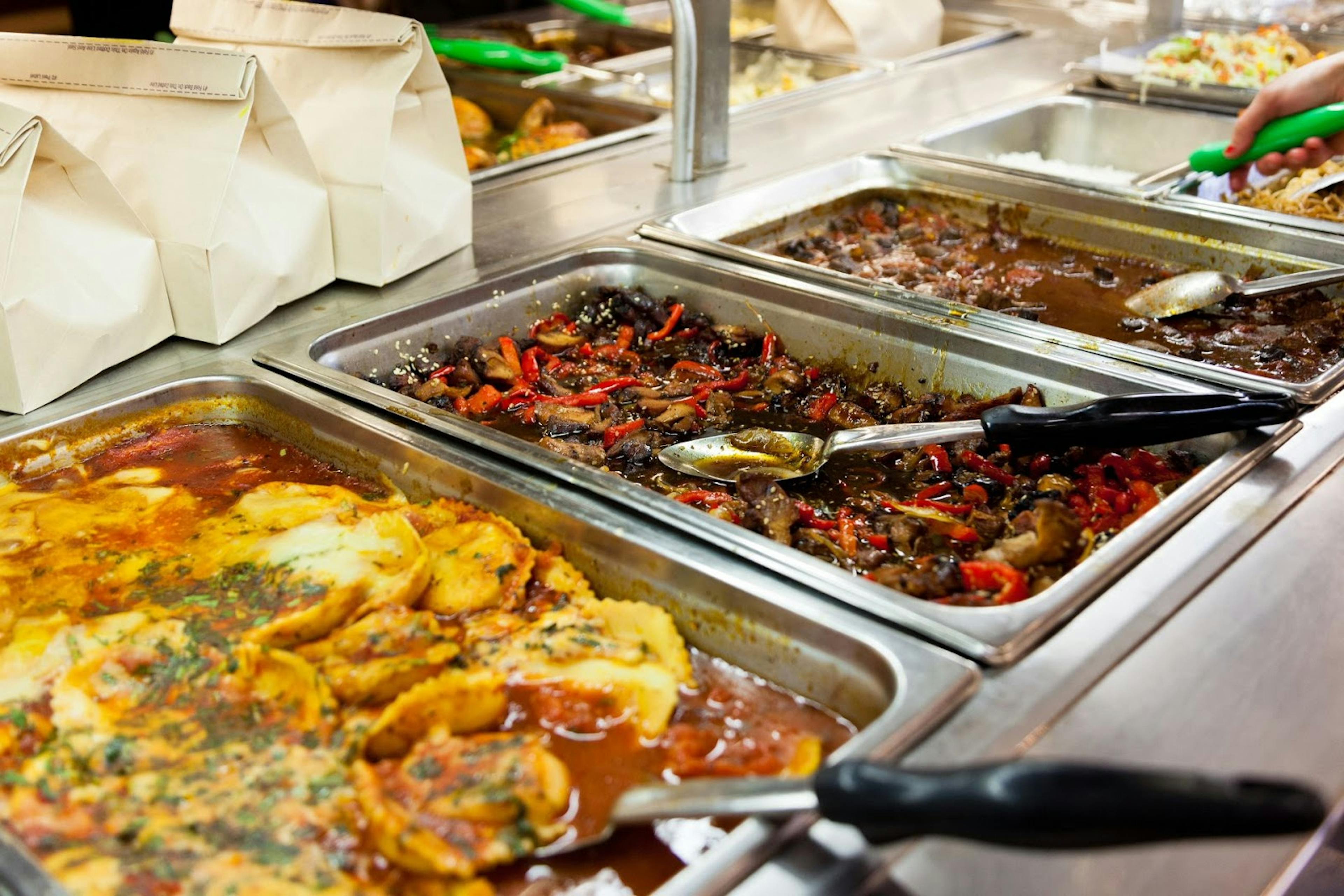 Though commonly used in catering, chafing dishes offer school cafeterias a practical solution for keeping food warm. Underneath these dishes, a fuel source such as Sterno cans indirectly heat a water bath to keep the food warm for hours.